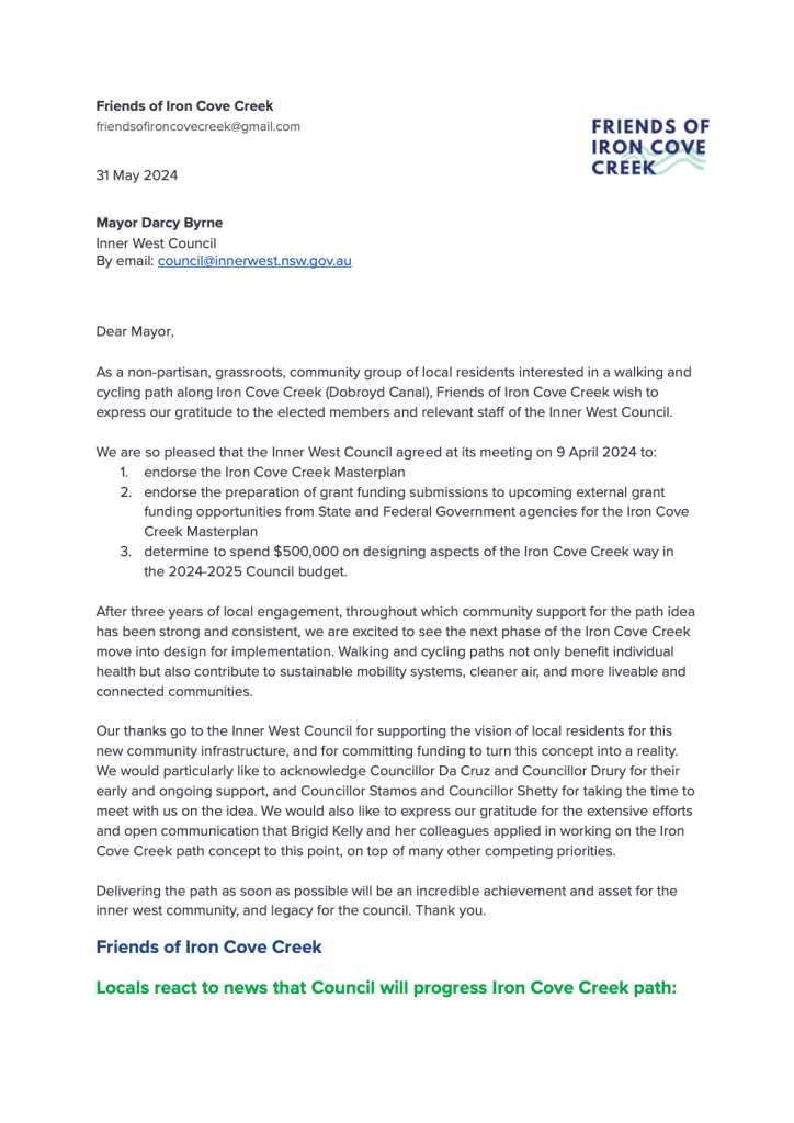 Friends of Iron Cove Creek thank you letter to the Inner West Council Share this: Click to share on X (Opens in new window) X Click to share on Facebook (Opens in new window) Facebook Like Loading...